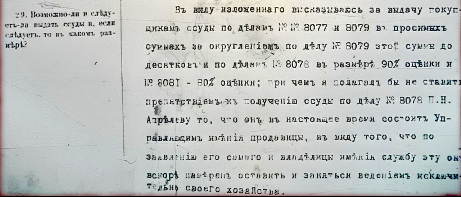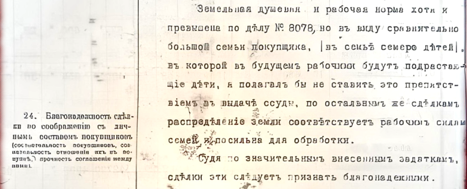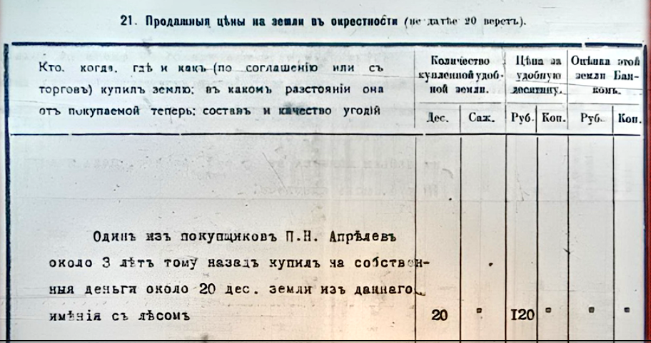 Некий Апрелев Павел Николаевич на момент совершения сделки, т.е. в 1911 году, состоял управляющим имения продавщицы земли Костенич Марии Владимировны. Три года назад он уже купил за собственные деньги около 20 десятин земли с лесом из этого же имения. 7 детей на момент покупки было у Апрелева. По условиям Банка он уходит со службы и переселяется на хутор, где вместе с детьми и собирается вести хозяйство на выкупленной земле. Что и подтверждается владелицей имения.